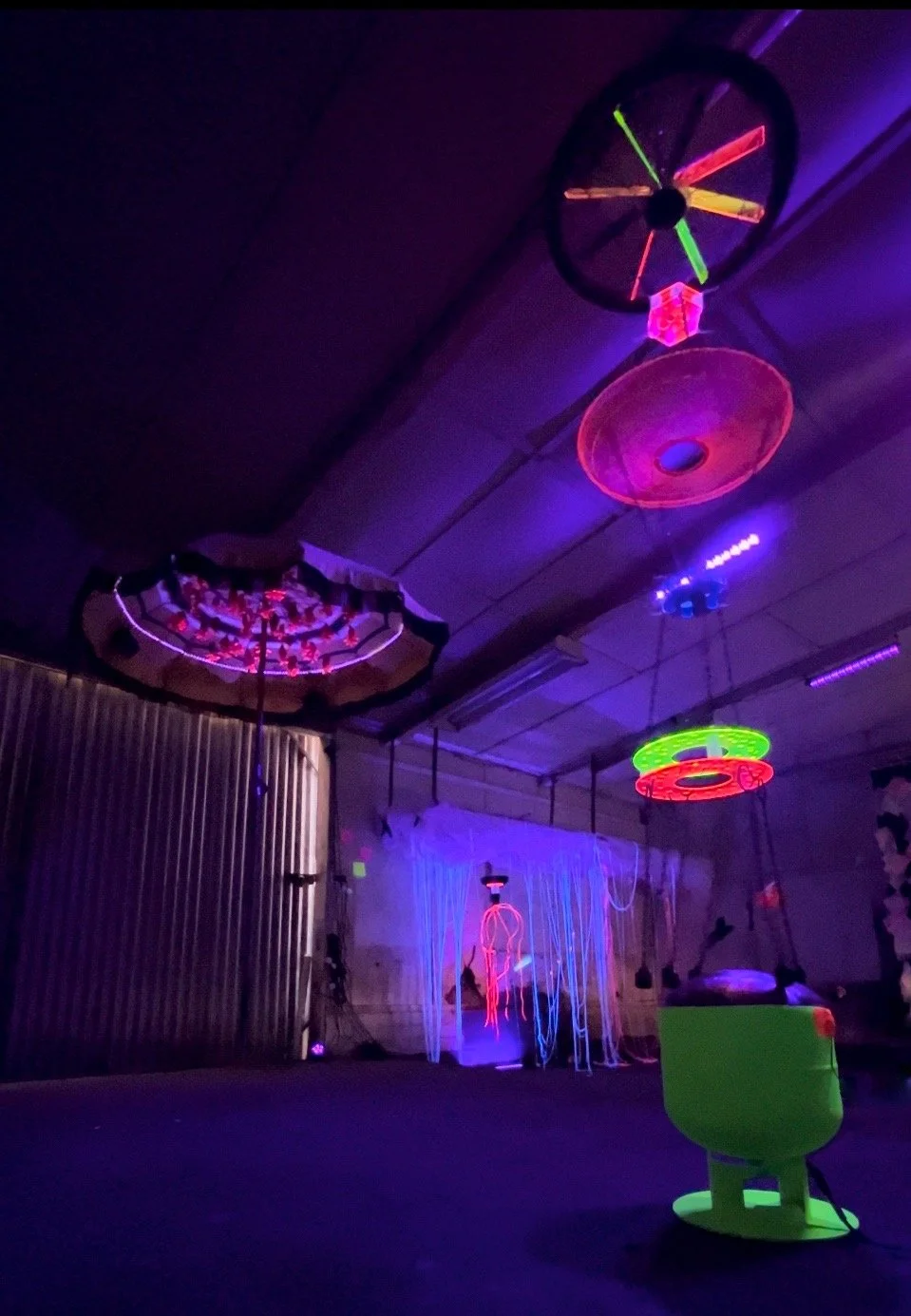 Remember Casablanca, 2024 - a site specific interactive installation presented in The Old Garage in Kandos for Cementa24. Inspired by the industrial decay of the site and local explorations in nature, visitors were invited to investigate and explore the biomorphic grove hidden within the disused mechanics’ work pit, ‘play’ with improvised tools to generate live sound, and listen to a poetic narrative accompanied by an improvised sound scape, all under the time altering glow of ultraviolet light.