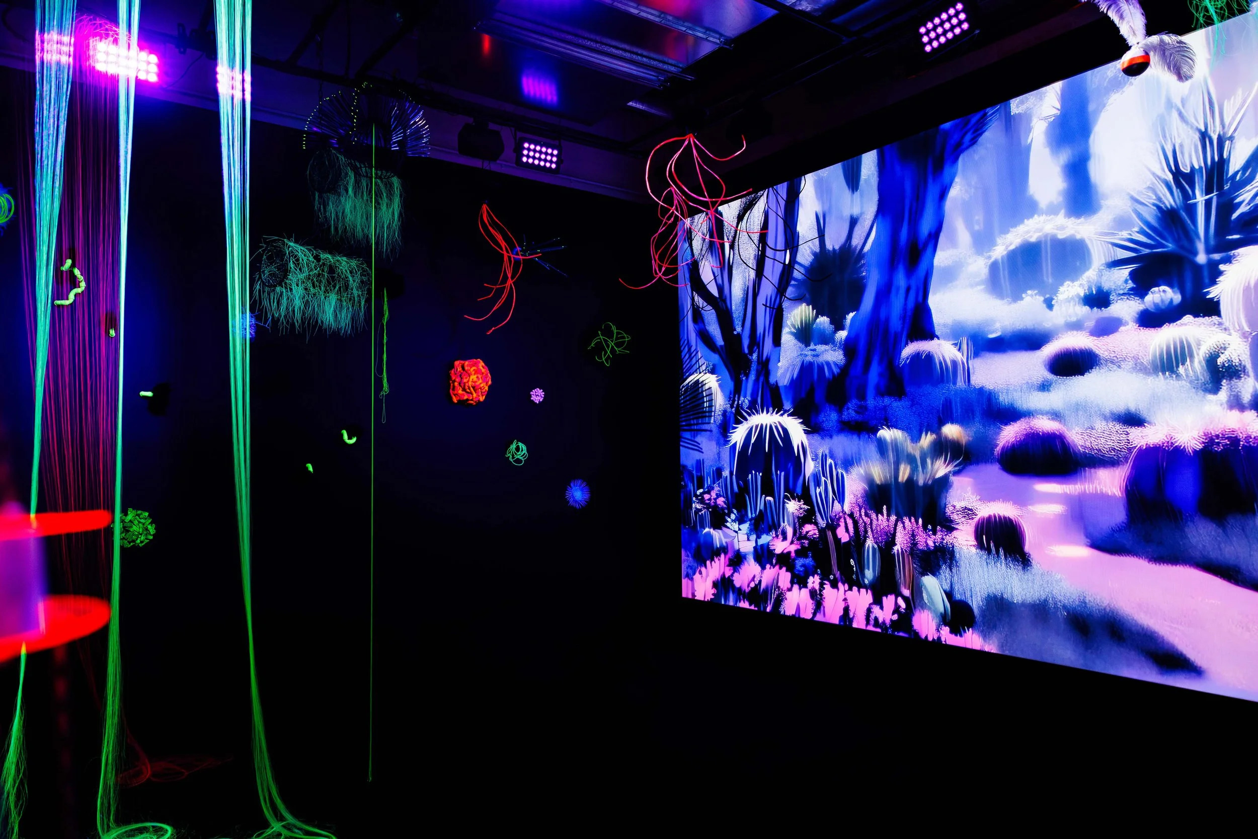 Combining animation, sound, sculpture, electronics and ultraviolet light, the artists have created a biofuturistic environment that reflects nature’s ever-changing desire for adaptation and experimentation.