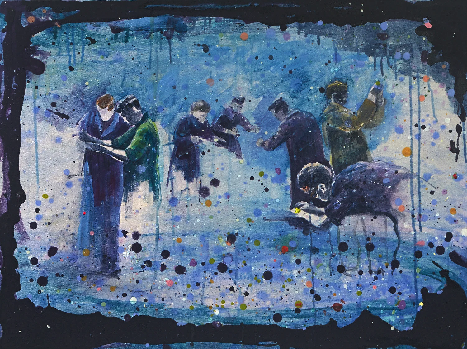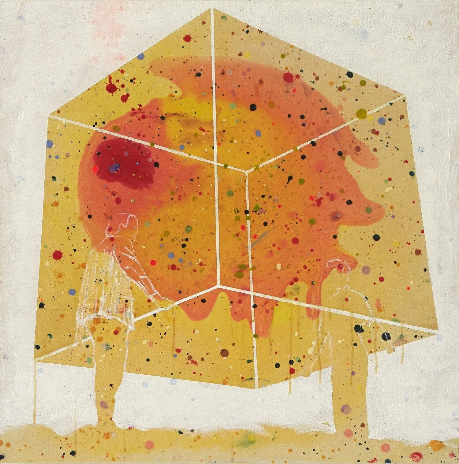 The element of chance is incorporated into the works through the process of creating the painted landscape. Paint and other fluid mediums are washed, poured and dripped onto the canvas with intent, yet the outcome is not always certain. This uncertainty allows for the discovery of a space that was not yet known. Employing ‘unnatural’ saturated colour, a ‘hyper’ real space; a space of dreams, coloured memories and future possibilities evolves and is populated by a band of characters sourced from vintage photographs. These figures are taken out of context and transported into this alternate reality of my own creation.